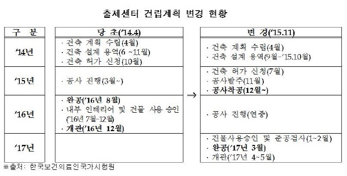 복지부는 자연재해대책법에 따라 자연재해 영향을 분석하는 사전재해영향성검토가 불필요한 것으로 판단했으나조달청의 지적에 따라 검토를 실시하게 돼 일정이 지연됐고,
